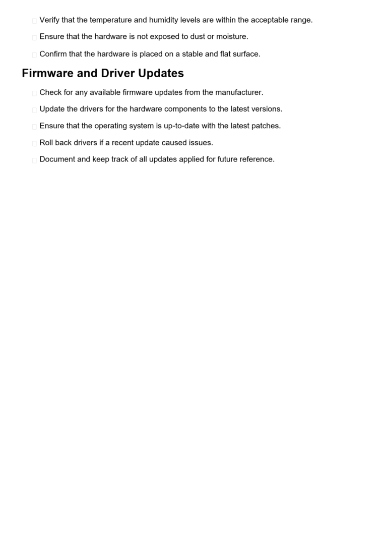 Preventive maintenance is essential to ensure that the hardware remains in optimal condition and to preempt future issues. This involves regular checks and updates. Here are some preventive measures to implement:
